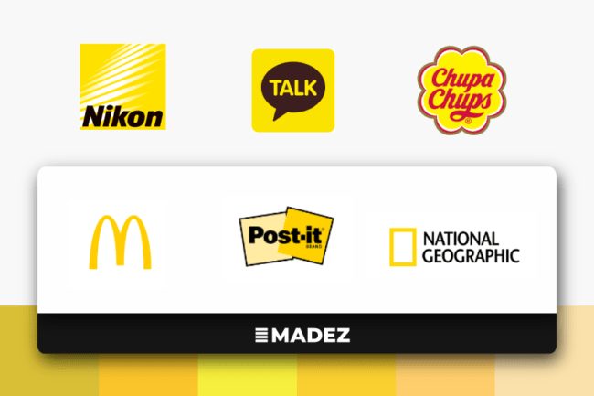 노란색은 세계 TOP 100위 브랜드 중 13개 브랜드에서 이용되는 색상입니다. 노란색은 주로 정체성에 ‘긍정적’, ‘행복’의 이미지를 주고자 하는 브랜드에서 자주 이용됩니다. 또한 노랑은 눈에 띄는 색상인만큼 “창의적”이라는 이미지를 부여하는데도 자주 이용됩니다.